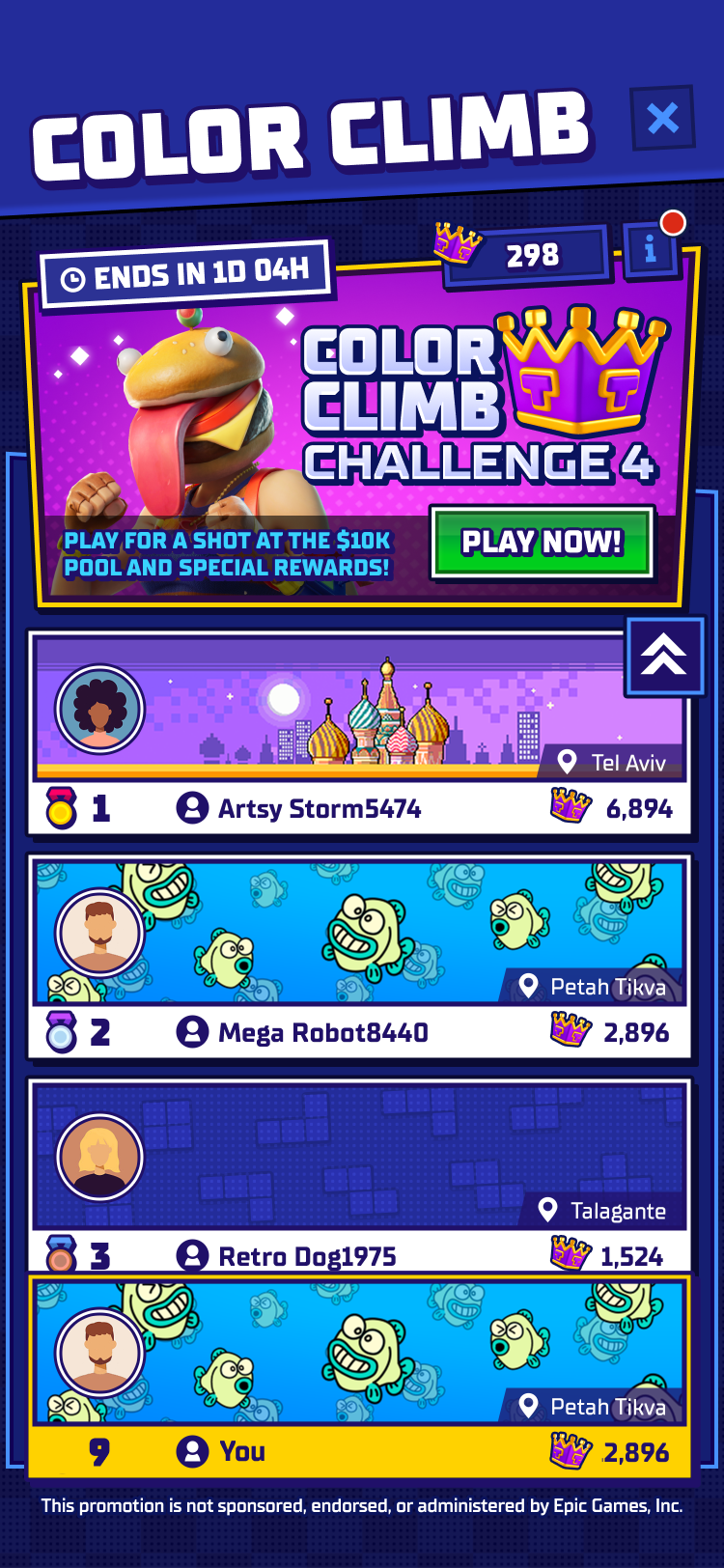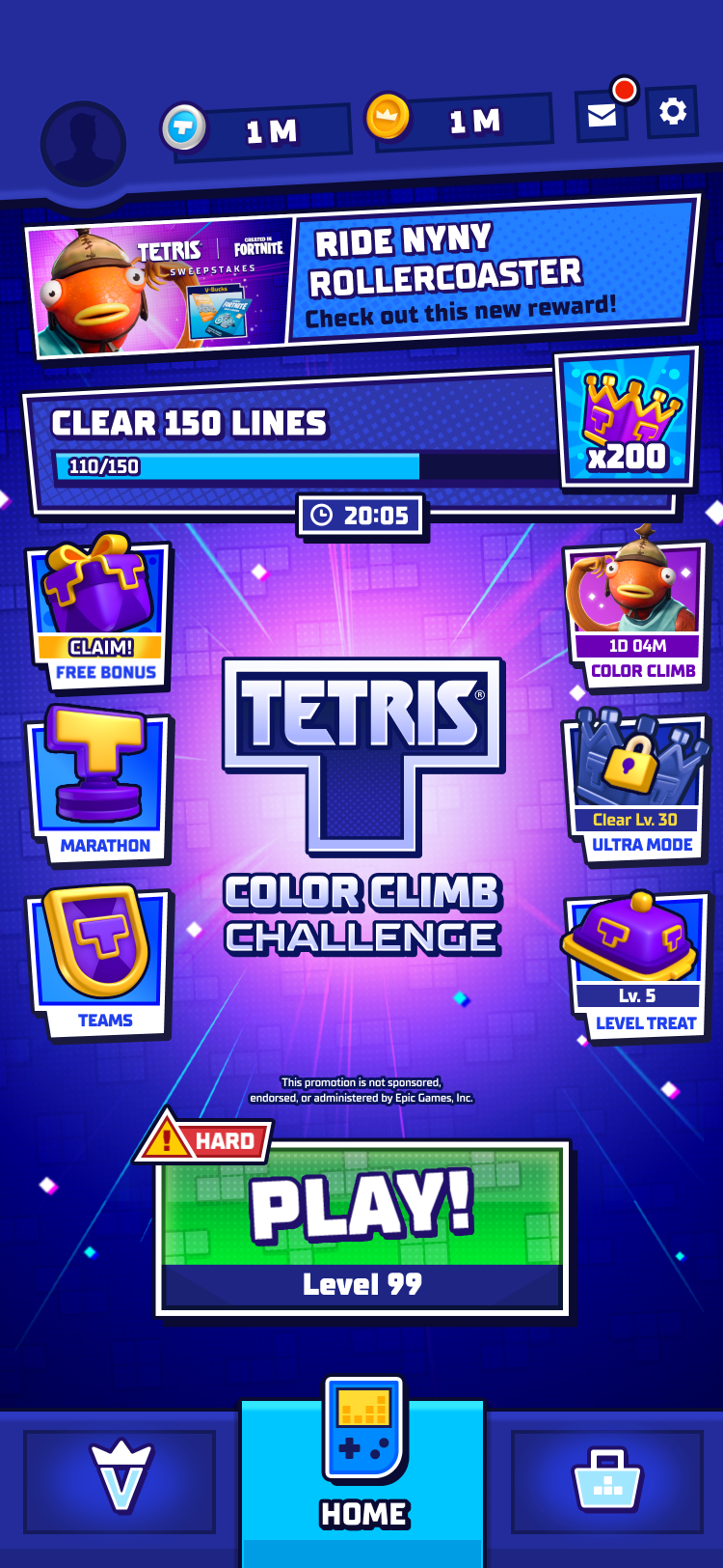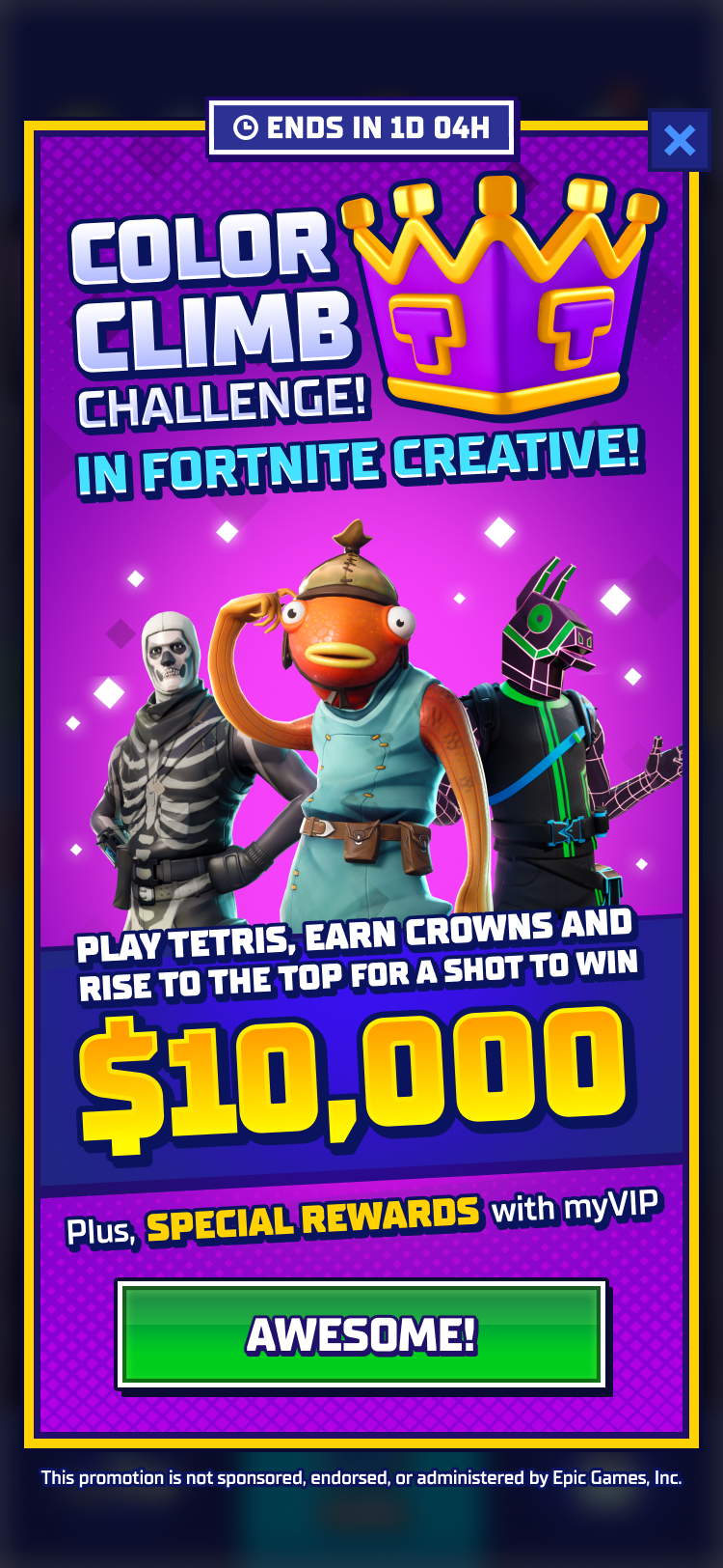 The Fortnite TETRIS Color Climb Challenge was a special crossover built in Fortnite Creative to celebrate Tetris’ 40th anniversary. The campaign connected Fortnite Creative with the mobile Tetris app, where players competed to top the leaderboard, earn a spot in the event, and unlock weekly Fortnite rewards.