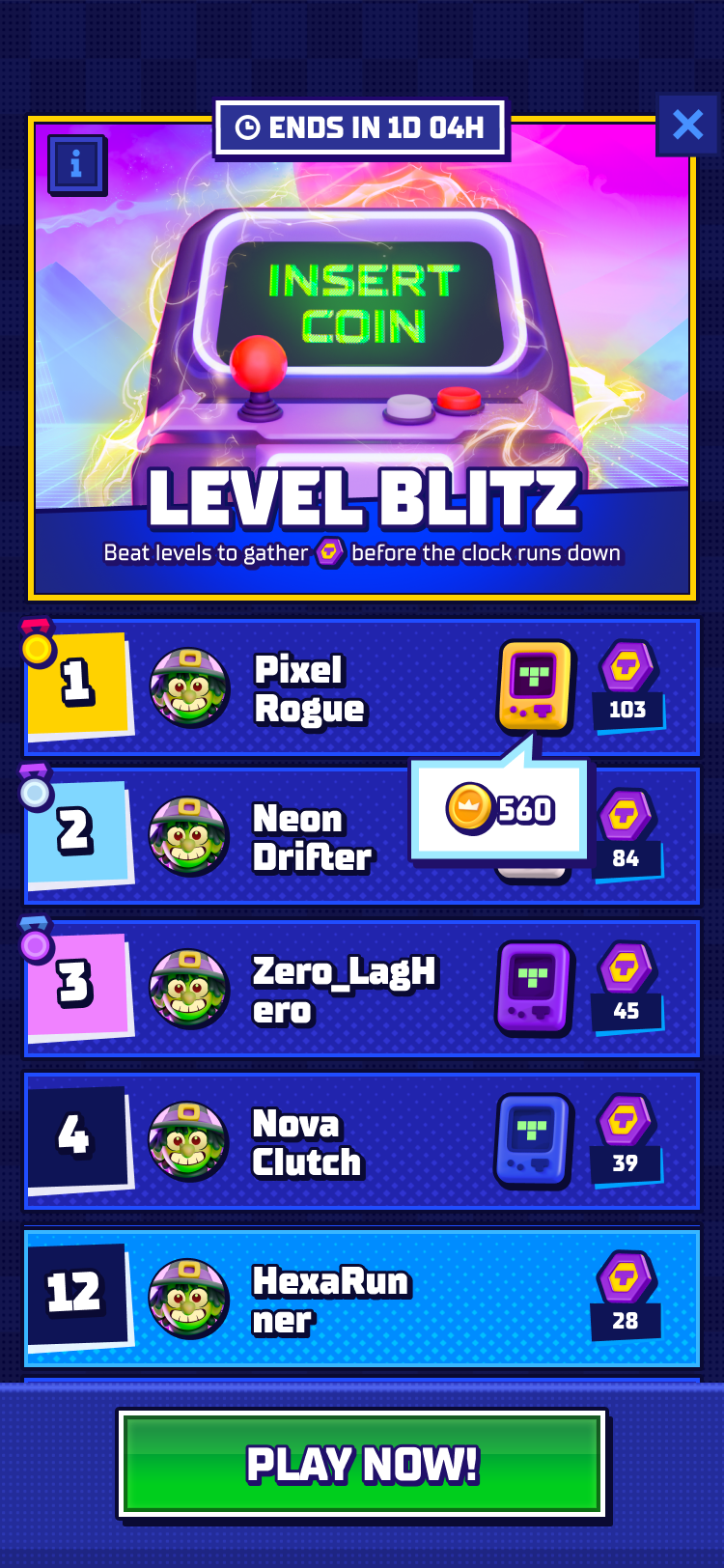 During my final period at playSTUDIOS, working in parallel with seasonal events, I collaborated with the product team and led the creative team to design competitive live features, including Skip-its, Tetris Pass, Levels Race, Level Blitz, Block Quest, and Premium Levels. These time-bound, progression-driven features encouraged players to complete levels under clear rules, with visible leaderboards and structured reward tracks. Each feature was designed to create urgency while maintaining clarity and fairness during limited-time events.